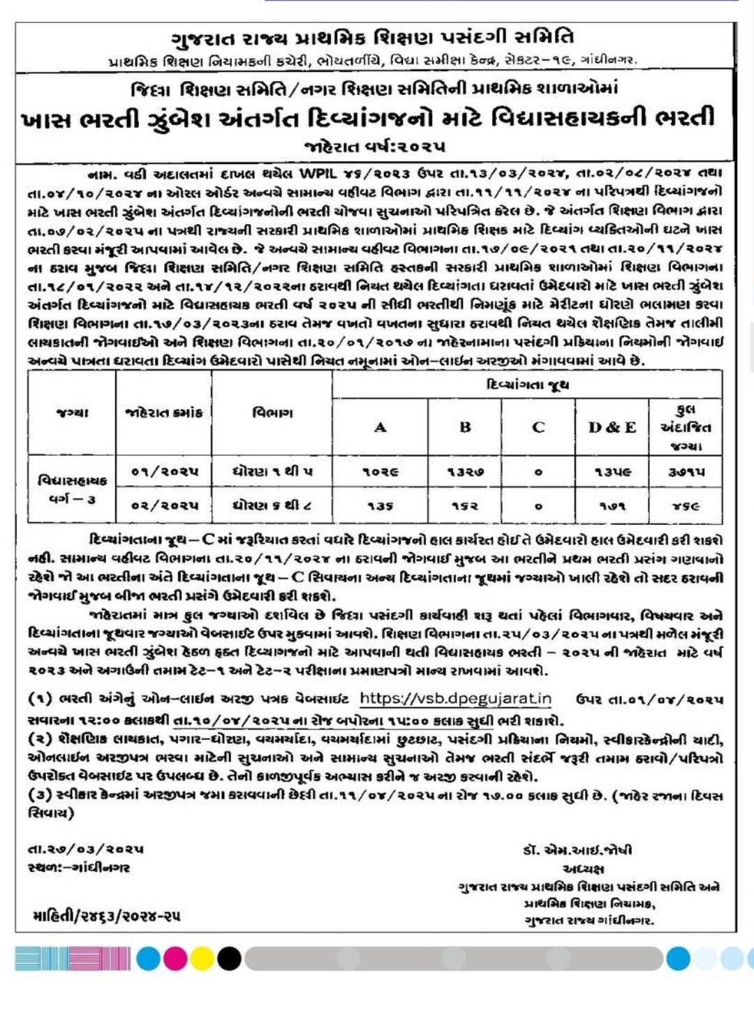 GPESC Vidyasahayak Recruitment 2025: Special Opportunity! The Gujarat State Primary Education Selection Committee (GPESC) has launched a special recruitment drive for 4,184 Vidyasahayak (Primary Teacher) posts exclusively for Divyang (PwD) candidates. This initiative aims to promote inclusive employment in Government Primary Schools across Gujarat. Apply online from 1 April 2025 to 10 April 2025!