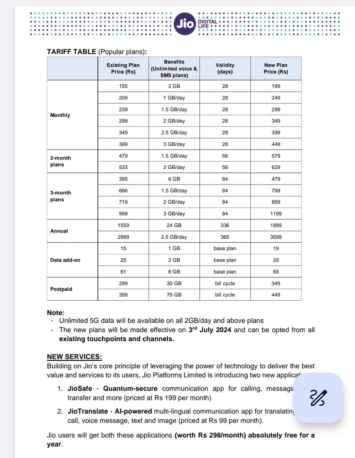Jio Airtel Mobile Recharge New Rate: Jio અને Airtel પ્લાન આજથી મોંઘા થઈ ગયા છે. હવે યુઝર્સે આ કંપનીઓના રિચાર્જ કરાવવા માટે વધારે પૈસા ખર્ચવા પડશે. જિયોનો સૌથી સસ્તો પ્લાન 155 રૂપિયાના બદલે 189 રૂપિયાના થઈ ગયા છે. તો એરટેલ ને પણ કિંમતમાં વધારો કર્યો છે. વોડાફોન એરટેલના પ્લાનમાં આવતીકાલથી વધારો થવા જઈ રહ્યો છે.