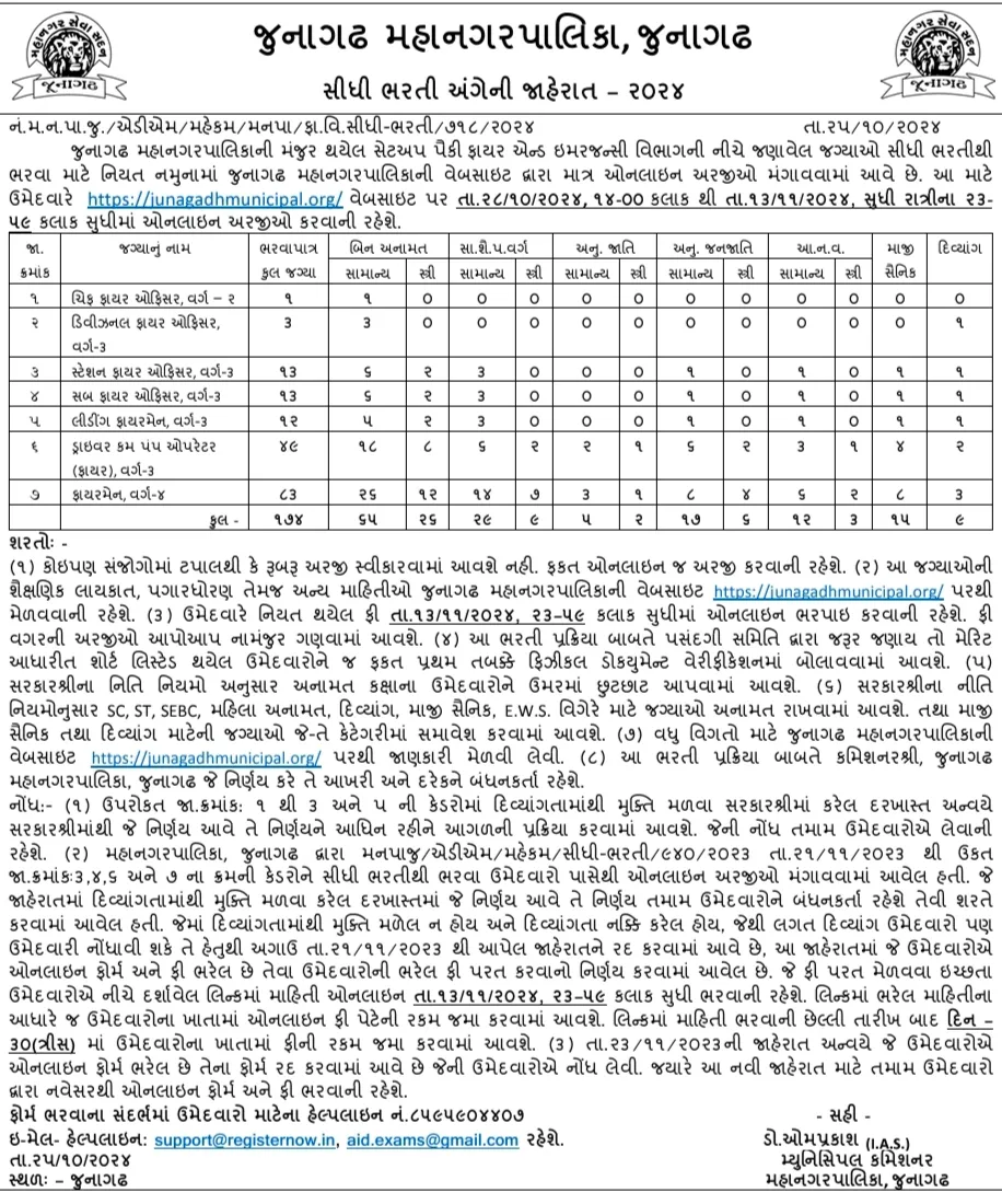 - (૨) આ જગ્યાઓની શૈક્ષણિક લાયકાત, પગારધોરણ તેમજ અન્ય માહિતીઓ જુનાગઢ મહાનગરપાલિકાની વેબસાઇટ ttps://junagadhmunicipal.png, ‘પરથી મેળવવાની રહેશે.