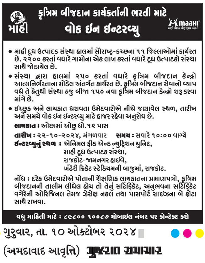 Place for interview: Animal Feed & Nutrition Unit, Mahi Milk Manufacturing Institute, Rajkot – Jamnagar Highway Next to Khanderi Cricket Stadium, Rajkot.